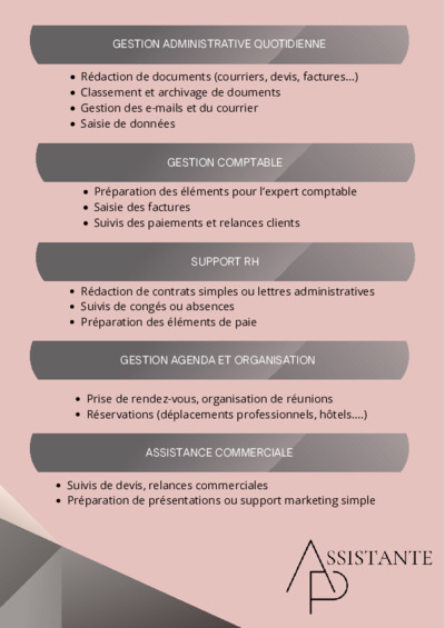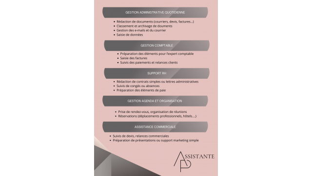 Mon activité Assistance administrative pour les entreprises et les particuliers à temps partagé comprenant des travaux de secrétariat, informatiques, gestion commerciale, devis, bons de commande, facturation. Gestion des relations et suivi des clients et fournisseurs des entreprises clientes. Prise en charge du standard téléphonique et gestion des agendas. Conseil en organisation administrative.