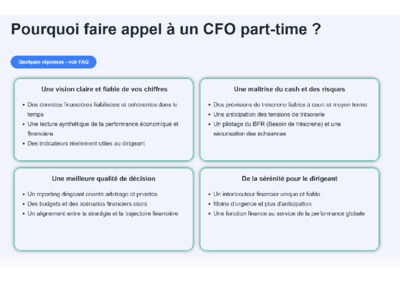 En intervenant quelques jours par mois, c'est particulièrement adapté lorsque l'entreprise grandit, recherche un financement, souhaite procéder à des transformations ou souhaite retrouver un équilibre financier.