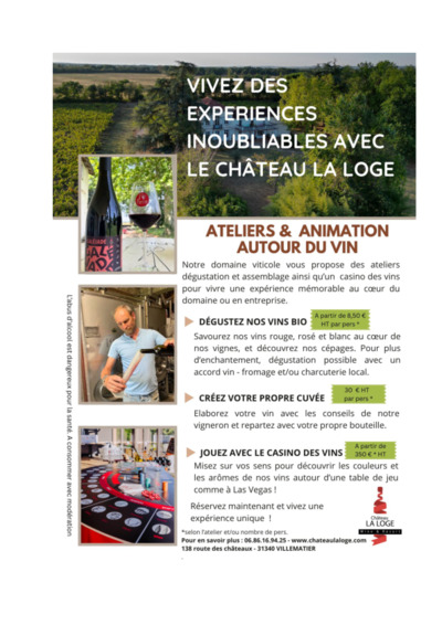Domaine viticole de 6ha dans le nord toulousain (au milieu du triangle Toulouse-Montauban-Albi), nous proposons notre vin BIO en rouge, rosé et blanc à la vente au domaine, ainsi que 4 chambres d'hôtes pour un séjour professionnel ou touristique, des visites du domaine avec dégustation de nos vins et autres ateliers ludiques en groupe (dégustation/quizz, assemblages de cépages, casinos des vins de fronton). Nous pouvons également organiser vos événements corporate au domaine (séminaire, team building, AG/CA, lancement de produits, etc)