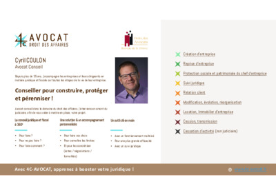 Avec une expérience de plus de 35 ans dans le droit des affaires et une orientation de conseil en matière juridique et fiscale, j'ai fondé en 2019 le cabinet 4C-AVOCAT pour accompagner les entreprises & les chefs d'entreprises dans toutes les étapes de la vie de leur entreprise : Création / reprise / accompagnement juridique / modifications / restructurations / relations clients (CGV – contrats) / immobilier d'entreprise (locatif - investissement), cession, transmission et cessation d'activité / accompagnement du chef d'entreprise au niveau patrimonial (protection & transmission) et de sa couverture sociale. Ma mission n'est pas judiciaire et se veut en amont du judiciaire.