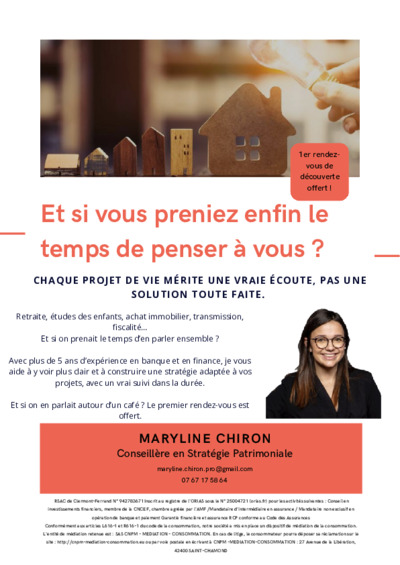 J'ai 26 ans et je vis à Clermont-Ferrand. Avant de me lancer comme conseillère en gestion de patrimoine indépendante, j'ai travaillé plusieurs années en banque, ce qui m'a permis de bien comprendre les mécanismes financiers et les besoins des clients.