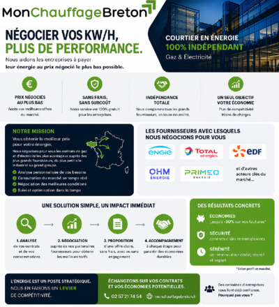 Mon activité MonChauffageBreton.fr est un cabinet de courtage indépendant spécialisé dans l'énergie et les solutions de chauffage pour les particuliers et les professionnels.